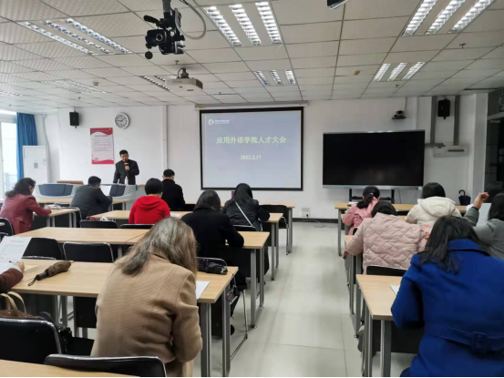 2022年2月17日上午,应用外语学院在第二实训楼803召开学院人才大会,会议由学院临时行政负责人章国军主持,学院党总支书记周延辉、党总支副书记张炜斌、副院长黄奕云出席了会议。